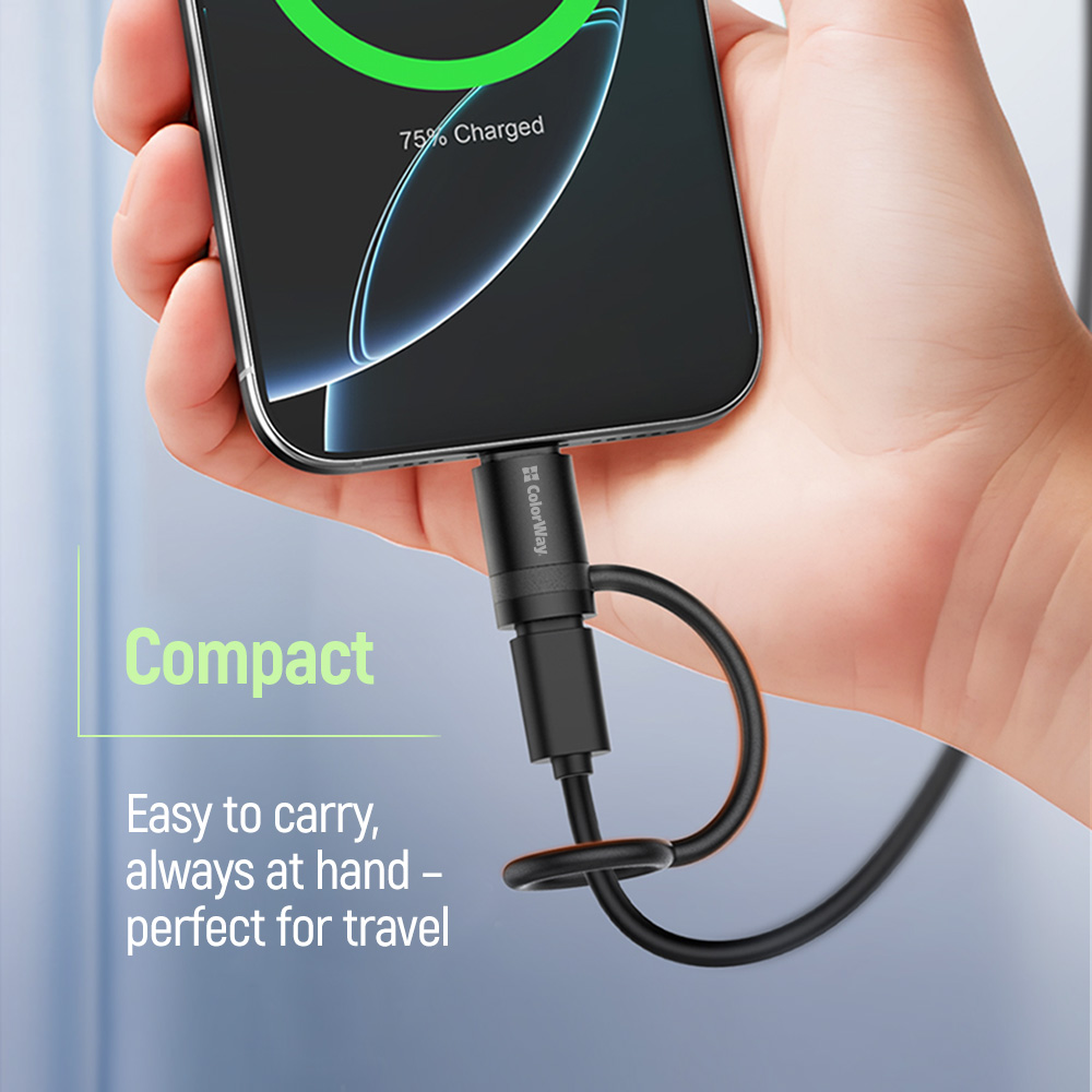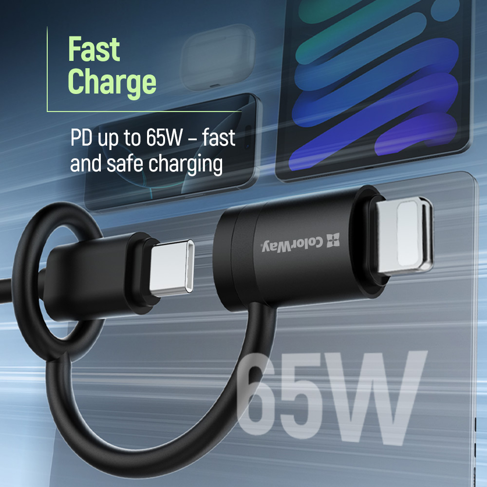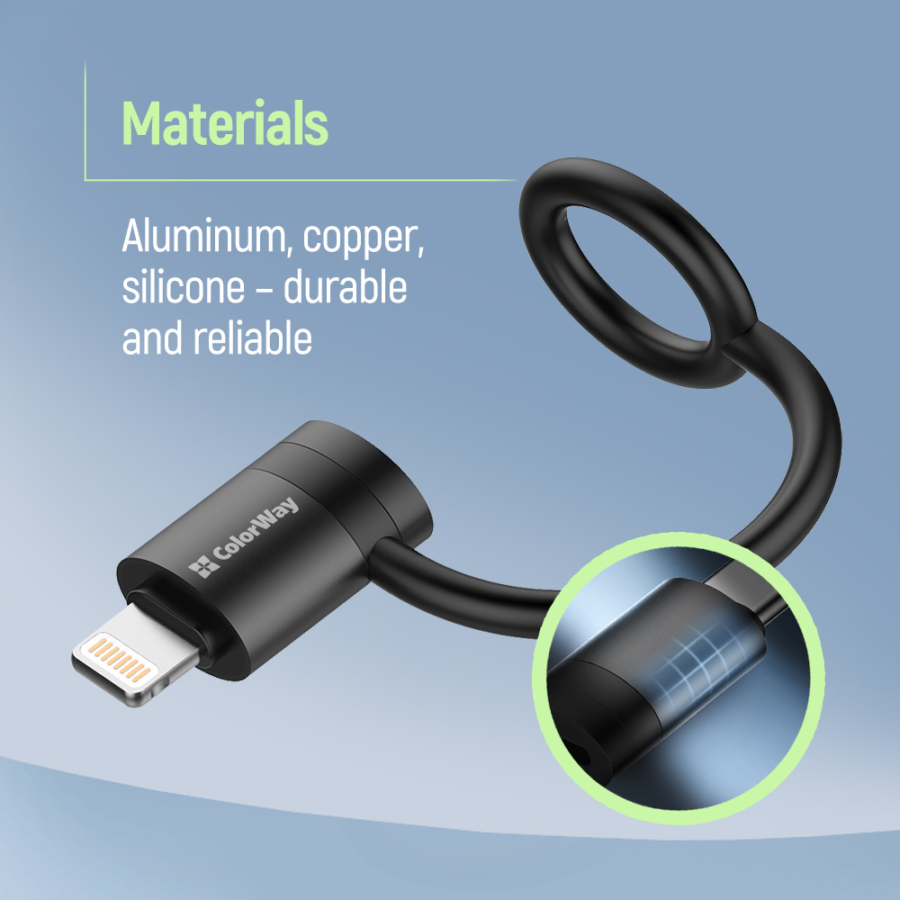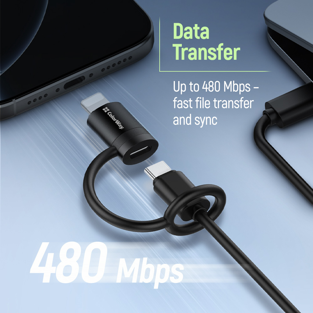 The ColorWay Lightning to USB-C Adapter allows you to use USB-C cables with Lightning devices, providing maximum convenience in everyday life and at work. Supports fast charging up to 65W and data transfer speeds up to 480 Mbps, making it ideal for use with iPhone, iPad, and other Apple devices.